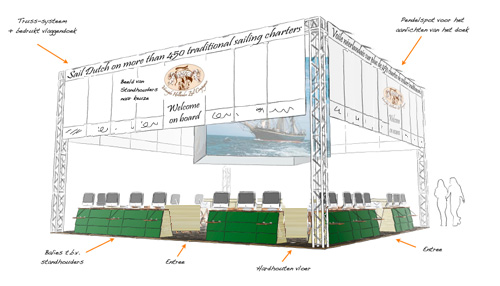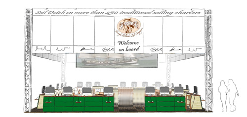 Aan deze constructie hangen de banners met afbeeldingen van de deelnemers en hun logo boven hun standgedeelte. Langs de fries een algemen welkomsttekst in vier talen en LED pendelspots voor de uitlichting van de banners. Rondom 20 units met aan elke zijde van de stand een brede ingang. Op elke unit een 17" beeldscherm/computersysteem met internetaansluiting in een vaste opstelling. Op de stand is WiFi beschikbaar voor de deelnemers. De vloer wordt gelegd met hardhouten tegels van 1 x 1 meter x 0,03 meter om alle kabels onderdoor te leggen die nodig zijn voor stroomvoorziening en internetaansluiting van de units. In combinatie met de banners boven de units, de computer met eigen website en/of presentatie op de desk, een vrij paneel achter de unit en voldoende verlichting kan de diversiteit en de identiteit van iedere deelnemer worden gepresenteerd. In het midden van de stand kunnen de gasten plaats nemen voor een goed gesprek en een drankje in een scheepse omgeving. De stand wordt aangekleed met diverse maritieme rekwisieten en passende sfeerverlichting.